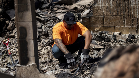 Lester perdió su casa en el incendio de Lahaina. El 11 de agosto regresó a buscar entre las ruinas del dormitorio asolado de su vivienda la urna que contenía las cenizas de su hijo. Son muchos los que han perdido sus casas y pertenencias en la ciudad, reducida a escombros.