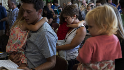 Noelle (en el centro), una habitante desplazada de Lahaina, también perdió su casa en el incendio de Lahaina. El 13 de agosto acudió al servicio conmemorativo en el Maui Coffee Attic junto con una menor.