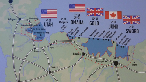 El pueblo de Arromanches ya pertenece al sector conocido en clave como Gold, que fue asignado a la 50ª división de infantería británica. Al igual que en Utah, las tropas desembarcadas apenas encontraron resistencia y alcanzaron los objetivos previstos con apenas medio centenar de bajas. Muy distinta fue la suerte que corrieron los canadienses de la 3ª división, asignados a la playa de Juno, quienes recibieron un tremendo castigo desde la costa por parte de dos batallones alemanes. A media mañana, con el apoyo de algunos tanques Sherman, los canadienses pudieron avanzar hacia el interior pero setenta años después, en medio de la lluvia y la neblina, todavía se percibe el horror que tuvieron que sufrir aquellos hombres recién desembarcados desde el vientre de las lanchas, completamente expuestos al fuego enemigo en una extensión de arena batida desde todas direcciones. En la playa de Juno, un pequeño museo conmemora el sacrificio canadiense, mientras cerca de la playa, un gran libro giratorio expone al viento cientos y cientos de placas de metal con los nombres de los soldados muertos.