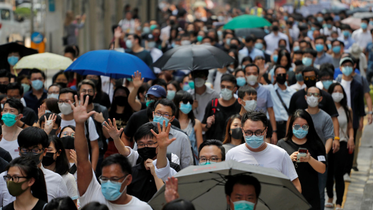Los manifestantes enmascarados ocuparon pacíficamente algunas calles de la zona financiera para volver a poner sobre la mesa sus reclamas y protestar contra los abusos de la policía con los activistas prodemocracia en marchas previas.