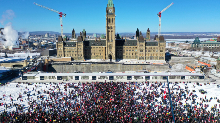 El pasado 29 de enero, un convoy de varios centenares de camiones de alto tonelaje y miles de personas se concentraron frente al Parlamento canadiense en Ottawa convocados por el movimiento antivacunas y grupos extremistas de derecha.
