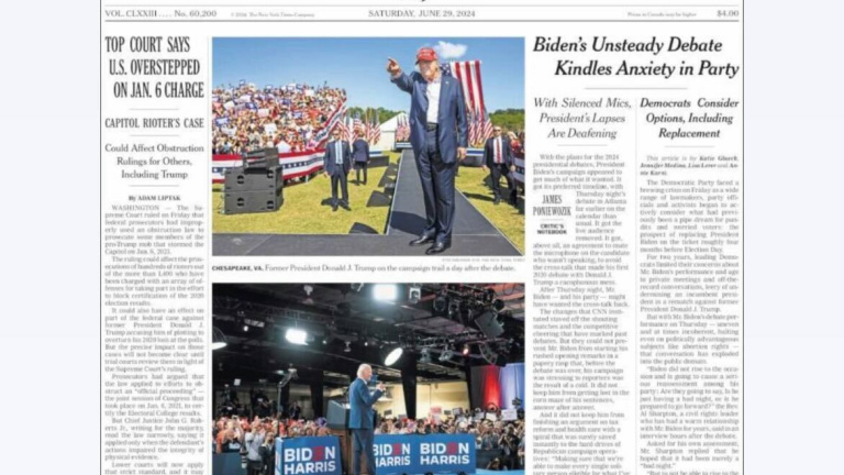 El periódico abre con las fotografías de los dos candidatos presidenciales, Joe Biden y Donald Trump. Remarcan que la actuación inestable de Biden durante el debate electoral de esta semana ha causado nerviosismo dentro su partido.