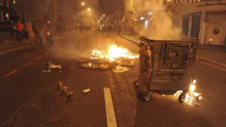De la marcha pacífica se pasó a una escalada de violencia protagonizada por un pequeño número de jóvenes, según la policía, que provocaron escenas de caos y numerosos daños materiales. Algunos comercios de la zona han sido asaltados y se ha podido ver a personas con carros de la compra llenos de objetos robados de dichos establecimientos.