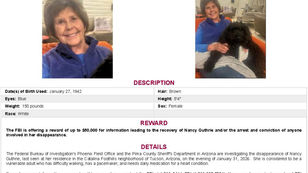 Nancy Guthrie, madre de la periodista Savannah Guthrie, lleva desaparecida desde el 31 de enero.