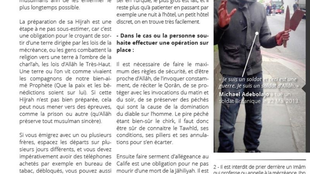 "Elegid siempre lugares frecuentados como zonas turísticas, grandes superficies, sinagogas, iglesias, logias masónicas, sedes de partidos políticos, lugares de pecado de los apóstatas. El objetivo es instalar el miedo en sus corazones", decía este artículo en lengua francesa.