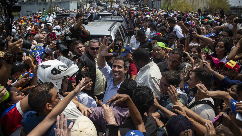Cuando se acerca el coche del autoproclamado presidente el fervor estalla. Es como si fuera a bajar del todoterreno una estrella del rock, un Cristiano Ronaldo, un actor de Hollywood. Pero cuando se abre la puerta aparece una figura enjuta con una camisa azul pálido perfectamente planchada. Una suerte de Albert Rivera caribeño que saluda tímido, aunque su cara denota que la batalla está perdida, que va a chocar contra un río de gente incontrolable, por muchos escoltas que le rodeen. Las mujeres mayores le acarician el pelo, los padres le acercan a sus hijos de pocos años, las adolescentes le agarran para robarle un selfie. El nuevo dirigente opositor tiene que atravesar a duras penas una maraña de brazos ávidos de liderazgo político y de teléfonos con la cámara en modo vídeo. Cuando llega a la tarima preparada para el mitin sigue repartiendo saludos, pulgares hacia arriba y una sonrisa enorme, aunque la semana no ha sido fácil para Guaidó.