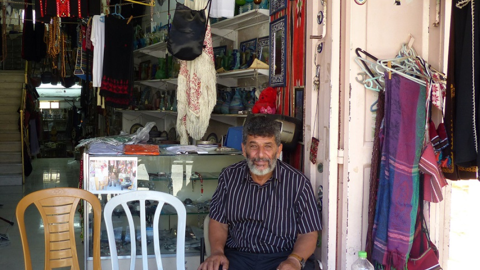 Escasos metros antes del checkpoint que da acceso a la calle se encuentra la tienda de artículos palestinos de Abu Muhammad. Sentado en la entrada y acompañado de café árabe caliente con el que invitar, mantiene la tienda abierta desde la mañana hasta la noche, haya clientes o no.