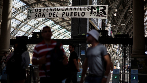 El plan económico del nuevo Gobierno argentino pasa por la desregulación de la economía, y uno de sus objetivos es la privatización de los ferrocarriles. En este sentido, en la huelga general de este miércoles se han podido observar pancartas colgadas en la estación de tren de Retiro con el lema "Los ferrocarriles pertenecen al pueblo".