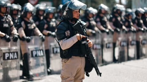 Miembros de la Policía y de la Prefectura Naval hacen guardia mientras los manifestantes se reúnen cerca del puente Pueyrredón durante el paro nacional. Tanto la Policía de la Ciudad de Buenos Aires como las fuerzas federales participan en el operativo. La ministra de Seguridad, Patricia Bullrich, anunció que la Policía cumplirá con el protocolo antipiquetes que implementó su cartera y que, inicialmente, impide que la marcha transcurra cortando el tráfico.
