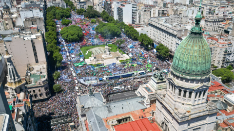 Fotografía aérea que muestra a manifestantes durante una protesta convocada por la Confederación General del Trabajo, hoy, en la Plaza del Congreso, en Buenos Aires.