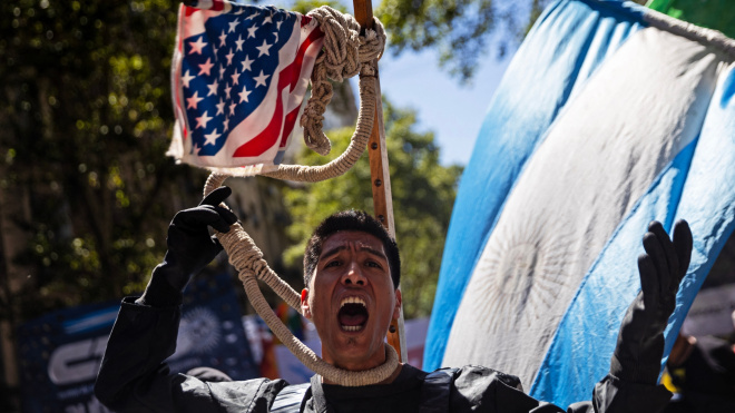 Imagen de uno de los manifestantes durante la huelga general convocada por los principales sindicatos y movimientos sociales de izquierda contra la política de ajustes de Milei. En concreto, contra un megadecreto y una ley ómnibus. Ambas medidas entierran derechos históricos de los trabajadores y desregulan varios sectores estratégicos de la economía. El plan de choque viene acompañado de una normativa antipiquetes que obliga a realizar las manifestaciones por las aceras y sanciona a aquellos que corten las calles durante las protestas. En esta imagen un manifestante simula con una soga el recorte en las políticas públicas.