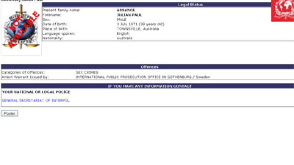 Interpol ha publicado la información en su página web, en la que consta que la orden de búsqueda y de captura de Assange, de 39 años, ha sido emitida a petición de la Oficina Internacional de la Fiscalía Pública de Gotemburgo, en Suecia, por supuestos delitos sexuales.