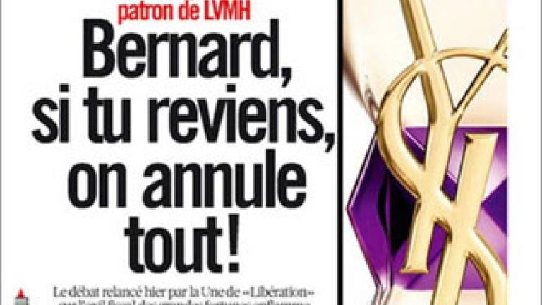 Este martes, el periódico progresista volvió a referirse a Arnault en su primera página titulando: ¡Bernard, si vuelves lo cancelamos todo!, como si Hollande fuera a retirar el impuesto por la marcha atrás del millonario. A su lado, un anuncio de Yves Saint Laurent, que seguro que no es casual.