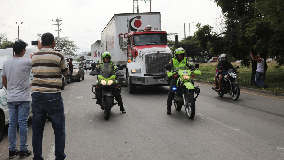 Los vehículos llegaron fuertemente escoltados por la Policía colombiana, que acompañó la caravana en motos y camionetas, ante la mirada atenta de más de un centenar de personas que se acercaron a ver cómo entraba al centro de acopio la primera asistencia.