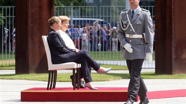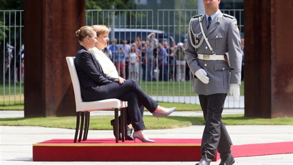 Angela MerkelMerkel rompe el protocolo y recibe sentada a la primera ministra danesa tras los últimos temblores