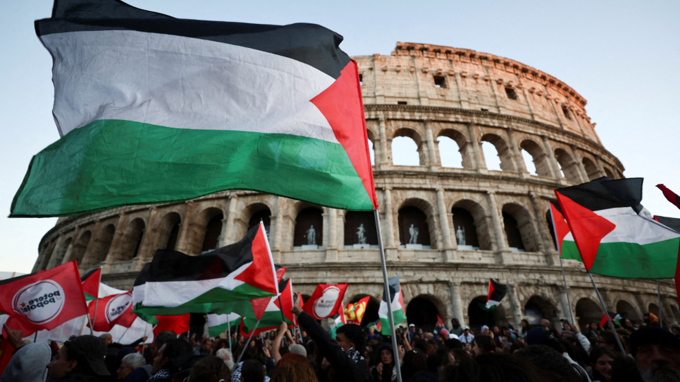 En Italia, más de 10.000 personas, según la Policía, convocadas por el colectivo Global movement to Gaza Italia, se han manifestado en las inmediaciones del Coliseo de Roma por el asalto a la Global Sumud Flotilla.