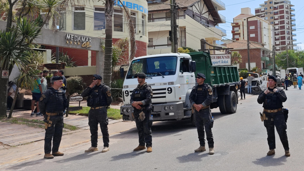 Miembros de la Policía custodian la calle en la que se derrumbó un edificio, en Villa Gesell, en la costa de la provincia de Buenos Aires (Argentina). Fernando Legarreta / EFE