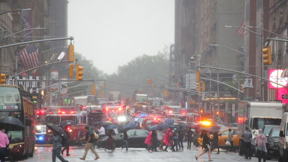 El Departamento de Policía de Nueva York informó de que el suceso tuvo lugar a las 13:43 horas a la altura del número 787 de la séptima avenida, con la calle 51, provocando un incendio en la azotea que ya ha sido extinguido, aunque se pudo apreciar una importante columna de humo.