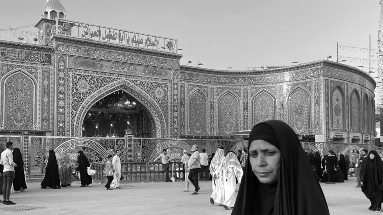 La ciudad sagrada de Kerbala es uno de los centros de peregrinación más importantes del mundo. Al anochecer, miles de musulmanes se apelotonan ante las puertas de los santuarios de los mártires Husein y Abas, ambos hijos de Ali y los más importantes 'santos' del chiismo. En la imagen, una mujer camina ante el santuario de Abas.