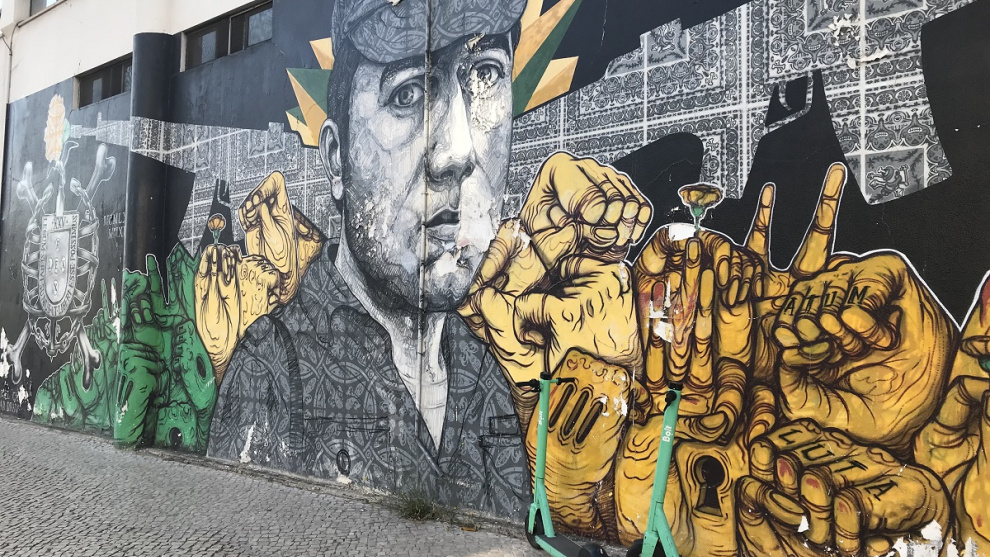 En los muros de la Facultad de Ciencias Sociales y Humanas de la Universidad Nova, en la céntrica avenida Berna de Lisboa, hay un grafiti de 15 metros creado por el colectivo de artistas Underdogs y dedicado a la figura de Fernando José Salgueiro Maia, el capitán de la Escuela Práctica de Caballería de Santarém que en la madrugada del 25 de abril de 1974 partió de esa ciudad hacia la capital portuguesa con una columna de tanques obsoletos para sumarse a la Operación Fin de Régimen: el alzamiento de los Capitanes de Abril que puso fin a la dictadura más antigua de Europa.