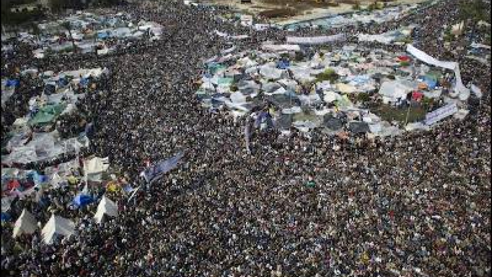 Miles de personas se reúnen en la plaza Tahrir de El Cairo para celebrar la caída del presidente Hosni Mubarak. Nada más conocerse la renuncia del dictador los congregados en este simbólico lugar estallaron de euforia. "El pueblo ha hecho caer al régimen", "El pueblo y el Ejército son uno", eran algunos de los lemas más coreados por la muchedumbre que trataba de acceder a la plaza.