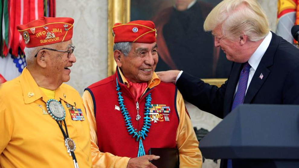 "Ustedes estuvieron aquí mucho antes de que ninguno de nosotros estuviéramos aquí", dijo Trump sobre los nativos americanos, que durante la Segunda Guerra Mundial desarrollaron un código basado en el idioma navajo para enviar mensajes cifrados e impedir así que el enemigo los entendiera si lograba interceptarlos.
