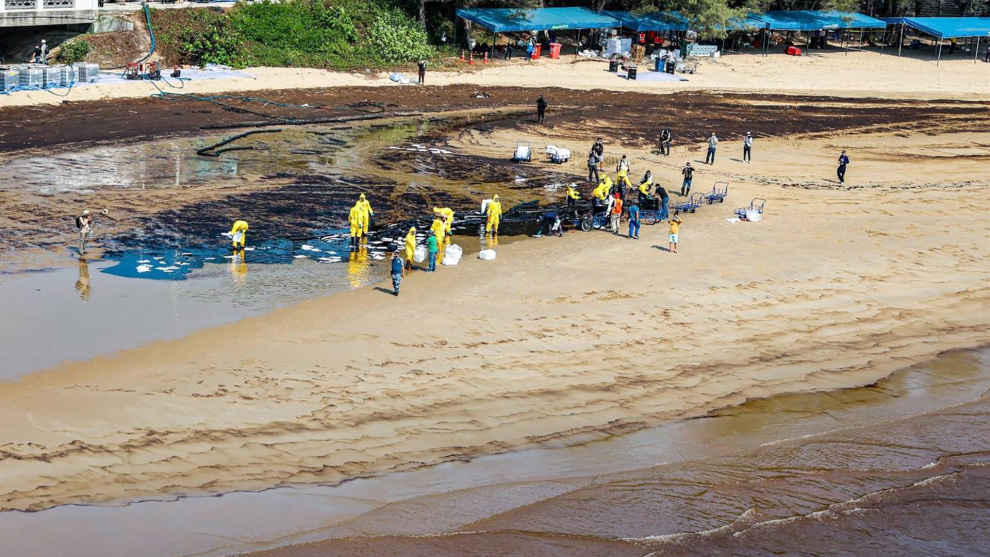 Un vertido de petróleo contamina una playa en la costa sureste de Tailandia