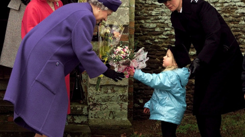 La reina Isabel II, con la presencia de su nombre, recibe un ramo de flores de un niño pequeño.