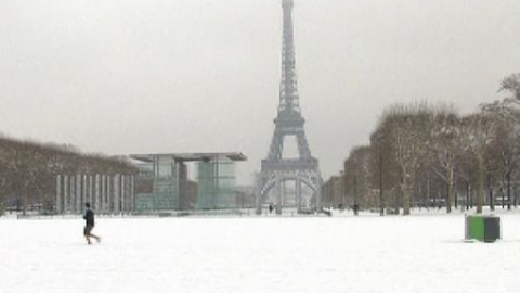 Hoy los parisinos tenían que esforzarse para ver el final de la Torre Eifel. Asi se han levantado hoy en la capital francesa, con esta bella estampa blanca. Desde la agencia francesa de meteorología han calificado con alerta naranja el temporal de frio. La nieve y el hielohan producido cancelaciones y retrasos en el transporte, pero aún así no han impedido que los niños disfruten de esta estampa tan típica del invierno.