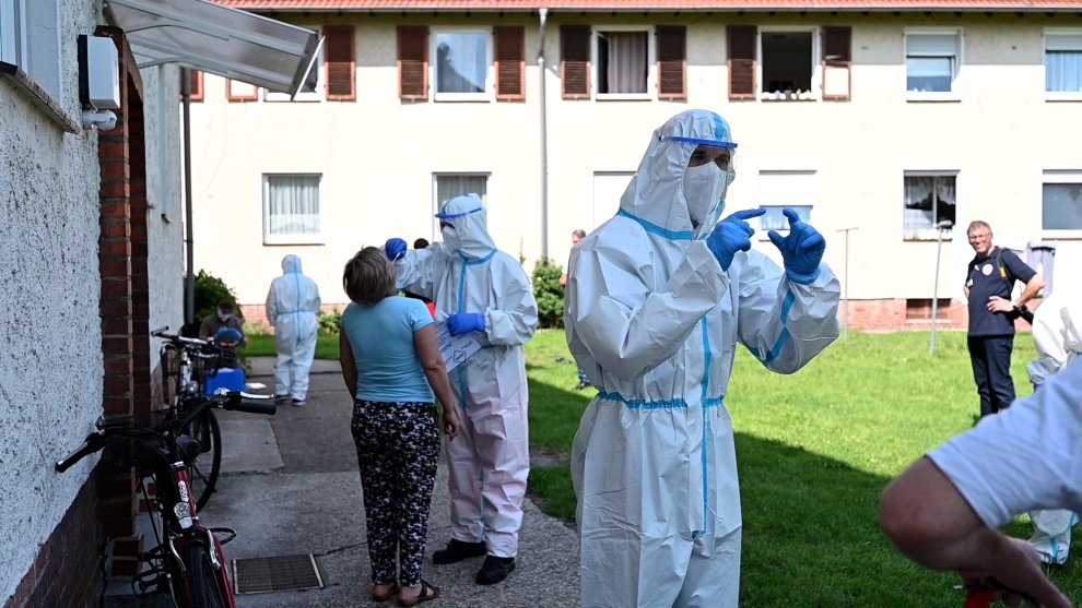 Imágenes de un matadero en el que equipos en trajes protectores realizan tests a los residentes en Rheda-Wiedenbrück, tras haber más de 1.300 personas infectadas. La producción se detuvo, haciendo que el caso Tönnies desencadene críticas fundamentales sobre el comportamiento de los mataderos.