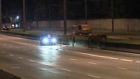 Estos caballos comen hierba en la mediana de una autopista de Río de Janeiro, Brasil. No les asusta el tráfico que circula junto a ellos. Pero cuando los bomberos acuden para retirarlos de la calzada, un conductor no hace caso a las señales y ocurre esto. El conductor, de 24 años, tuvo que ser rescatado por los bomberos. Pese a que conducía sin el cinturón de seguridad, no sufrió heridas de gravedad. Tuvo más suerte que un taxista que hace dos semanas murió al incendiarse su automóvil tras chocar contra otro caballo. En ambos siniestros los animales murieron.