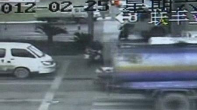 Estas imágenes muestran cómo un motociclista chino ha sobrevivido milagrosamente tras colisionar contra un camión en la provincia de Zhejiang. Las cámaras de seguridad registran el accidente hacia las 15:36 y en ellas se ve cómo la bicicleta se queda debajo del camión. Debido a la velocidad del vehículo, se desplazó diez metros más desde el lugar del atropello hasta pararse. La moto quedó destrozada y el conductor fue trasladado de urgencia al hospital.