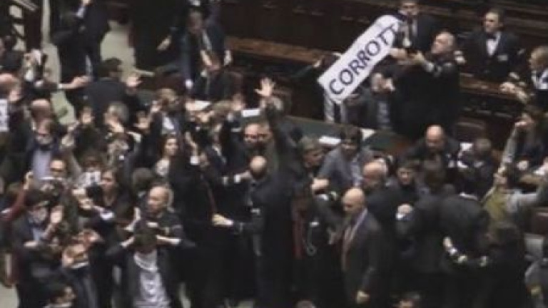 La tensión se palpaba en el ambiente durante el debate de las reformas económicas en Italia, pero la chispa saltó cuando el portavoz del FLI, Gianfranco Fino, habló con sarcasmo de la esposa del líder de la Liga Norte, Umberto Bossi, que se ha jubilado con solo 39 años. Fue entonces cuando varios diputados saltaron desde la tribuna a las bancas y se inició la pelea.