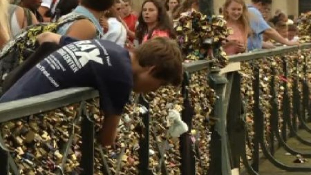 París, la eterna ciudad del amor. Eso sí, en lugar de flotar en el aire, esta vez, el amor se encadena a los puentes. Promesas de amor eterno que han terminado por romper el Puente de las Artes. El peso de "los candados del amor" ha derrumbado parte de este puente, que desde hace años se había convertido en lugar de culto para miles de parejas de enamorados de todo el mundo, que colocaban candados en sus barandillas para simbolizar su amor eterno. Sin embargo, este puente se ha visto desbordado por tanto amor. Esta moda comenzó en Italia a raíz de un libro de Federico Moccia. En él, sus protagonistas sellaban su adoración mutua con este gesto, para luego tirar la llave al agua. Y tanto gustó la idea, que se ha extendido desde la Muralla China hasta Sevilla donde, preocupados por su Puente de Triana, el Ayuntamiento ha decidido retiraros. Y es que, a veces, el amor pesa demasiado.