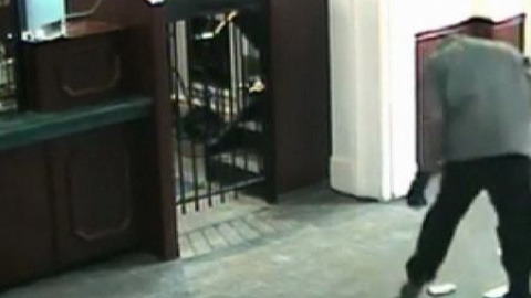Las cámaras de seguridad grabaron el momento en que este ladrón se diaponia a abandonar el banco que acababa de robar.En sus manos lleva varias docenas de fajos de billetes que se le van cayendo al suelo segun avanza hacia la salida.Junto a la puerta había dejado ese paraguas que intenta usar como bolsa para llevarse el botín.Aunque no lo veamos finalmente consiguió salir de allí, aunque su mala suerte siguió persiguiéndole, porque no había hecho mas que salir del banco cuando resbaló en una placa de hielo y se hizo un corte en la cabeza.Finalmente la policía le detuvo cuando pretendía huir a pie por las calles heladas de Washington con su botín de 20.000 dólares metidos en un paraguas.