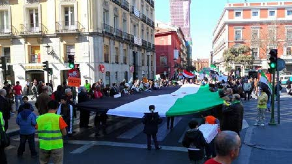 Un millar de sirios y españoles de origen sirio se han manifestado este domingo en Madrid para mostrar su desprecio por la propuesta de Constitución planteada por el régimen del presidente Al Assad, y que se vota este domingo. ?La sangre derramada no se olvidará? o "Viva Siria Libre?, han sido algunos de las cánticos de repulsa que se han coreado.