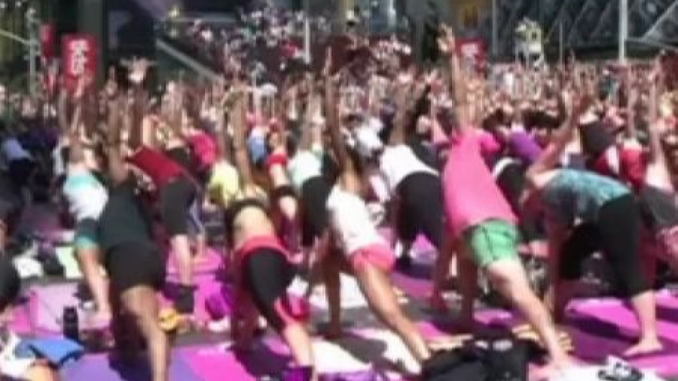 Una de las ciudades más ajetreadas del mundo, se toma un respiro. Miles de "yoguis" han acudido a una de las zonas más frenéticas de Nueva York, la plaza de Times Square, para celebrar la llegada del verano. "Se trata de dejar atrás la locura y el estrés al que todo el mundo tiene que hacer frente todos los días de su vida haciendo yoga en el corazón de la ciudad, Times Square", dice la profesora de esta clase masiva. En total se han repartido más de 1.200 colchonetas para esta clase gigante de yoga al aire libre. Porque lo inimaginable se ha hecho realidad, hacer meditar a Times Square.