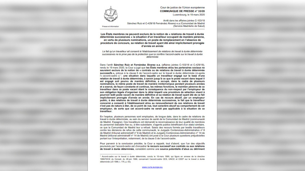 El Tribunal de Justicia de la Unión Europea ha dado la razón a varios empleados del Servicio Madrileño de Salud (SERMAS) determinando que la falta de convocatoria de procesos selectivos no justifica la perpetuación de puestos interinos, amparando su situación en Acuerdo Marco sobre el Trabajo de Duración Determinada.