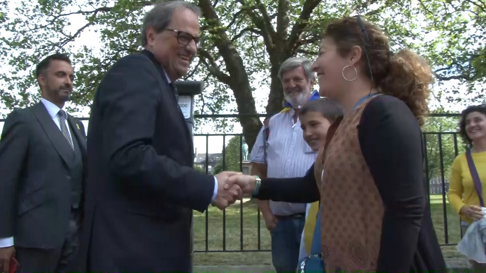 Imágenes del presidente de la Generalitat, Quim Torra, que ha visitado a la primera ministra de Escocia, Nicola Sturgeon, donde, a su llegada a la residencia, ha saludado a un grupo de catalanes que se han manifestado en la puerta a favor de los políticos encarcelados.