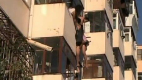 La vida de esta mujer corre peligro, su novio con el que discutía la sujeta para evitar que caiga desde su casa que está en la quinta planta.Ha sucedido en el norte de China, la mujer se ha resbalado y ha quedado colgada así del balcón.Los vecinos y su pareja hacen todo por ayudarla y evitar que caiga desde tan alto.Más tarde los bomberos han acudido a su rescateTOTAL BOMBERO"Desde el piso de abajo le he sujetado el pie para empujarla como podía hacia arriba"Con la ayuda de los bomberos desde el piso de abajo y de los vecinos y el novio desde la casa de la señora han conseguido salvar a la mujer de una terrible caída.