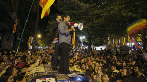 Jordi Sánchez y Jordi Cuixart se dirigen a los concentrados subidos al coche de la Guardia Civil la noche del 20-S de 2017. EUROPA PRESS