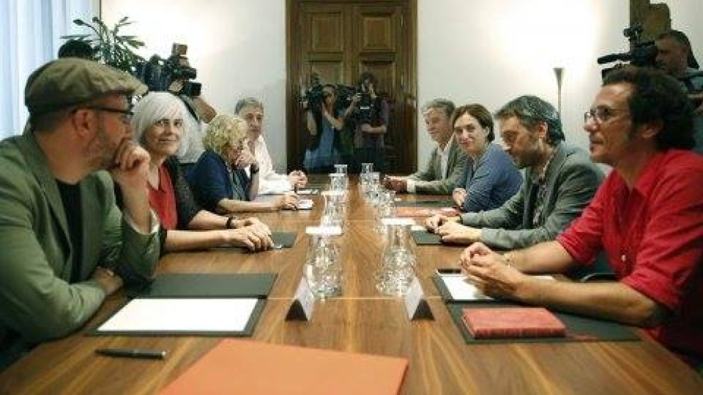 La foto de los ocho sentados en la misma mesa muy potente: de izquierda a derecha vemos a Martiño Noriega (Compostela Aberta); Dolors Sabater (Guanyem Badalona); Manuela Carmena (Ahora Madrid); Joseba Asirón (Bildu), alcalde de Pamplona; Pedro Santisteve (Zaragoza en Común); Ada Colau (Barcelona en Comú); Xulio Ferreiro (Marea Atlántica), alcalde de A Coruña y José María González Kichi (Por Cádiz Sí Se Puede). Los ocho se reunieron en Barcelona, no solo para decir aquí estamos sino porque conocen el soberano marrón que tienen por delante y eso, la verdad, pues se afronta mejor juntos que por separado. Hay mucha faena, y sólo "rascar la pintura" les va a tener entretenidos un tiempecito.
