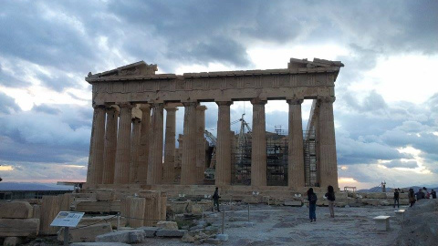 Salman Rushdie escribió que una visita al Taj Mahal pulveriza todas las postales y creencias previas; el viaje merece la pena “para recordarnos que el mundo es real, que el sonido es más verdadero que el eco, el original más convincente que su imagen en un espejo”. Otro tanto sucede con la Acrópolis de Atenas: yo había visto el monumento cientos de veces –en libros, en documentales, en películas–, pero el fogonazo blanco del templo inmortal brotando de una atalaya visible casi desde cualquier parte de la ciudad era asombrosamente inédito, recién nacido en mis ojos, como el primer amanecer sobre la tierra. De hecho, al día siguiente, cuando subimos hasta lo alto tras dejar a un lado el teatro de Dionisos, nos giramos para contemplar un cielo inmenso, cuajado de montes, mares y perspectivas, con el sol oculto entre nubes de tormenta, quizá el crepúsculo más bello que haya contemplado nunca. Me quedé un buen rato admirando el apocalipsis de la luz derramándose sobre el Pireo, sus fuegos chisporreteando, de pie entre los muros derruidos de la entrada, como si contemplara las mismas puertas del mundo.