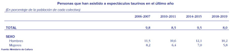 La práctica totalidad de las modalidades de festejos se estrellan, desde el buque insignia de las corridas de toros, al rejoneo o los festivales pasando, incluso, por las becerradas o el toreo cómico. A nivel de público, sucede exactamente lo mismo, la afición es absolutamente minoritaria, como demuestra el hecho de que la tasa de asistencia anual a espectáculos taurinos sea del 8% de la población en la encuesta que realiza el ministerio de Cultura; en los hombres sube al 10,2% y en las mujeres baja al 5,8%.