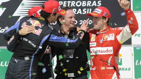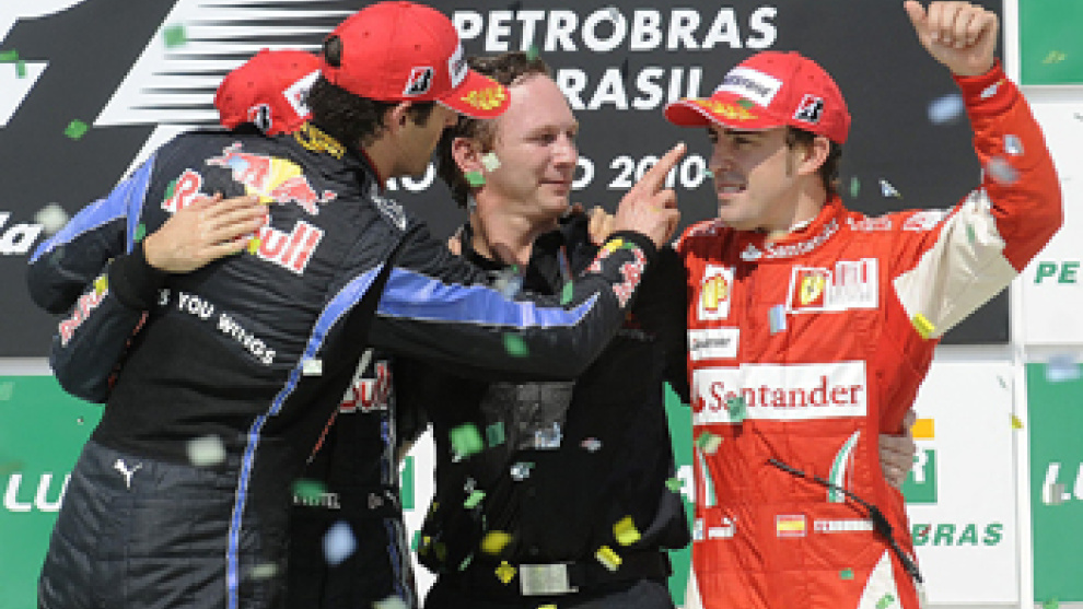 Fernando Alonso ha dado en Brasil un gran paso para proclamarse tricampeón del mundo el próximo domingo en Abu Dhabi. El asturiano ha terminado tercero el GP de Brasil, por detrás de los Red Bull de Vettel y Webber. Con este resultado la escudería de la bebida energética se ha proclamado campeona del mundo de constructores.