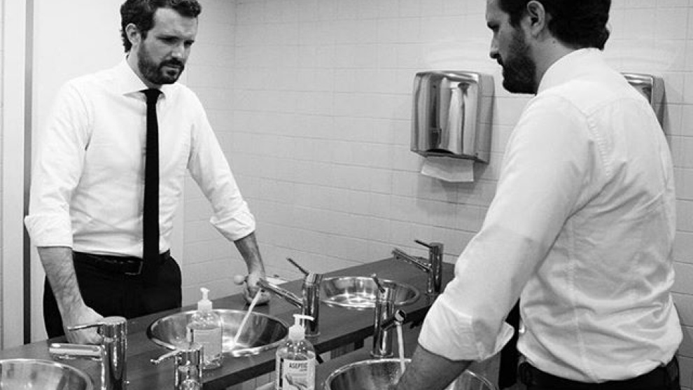 Como la situación no está para muchas risas, el otro día el asesor de imagen de Casado le manufacturó una foto para la historia: una composición tensa, en estricto blanco y negro, donde Casado está de pie junto al espejo del baño; la mirada baja, hosca, ceñuda; la corbata de luto; los puños de la camisa arremangados, con toda la pinta de ir a arreglar el grifo del lavabo, que no para de perder agua, o de fregotearse las manos concienzudamente durante veinte minutos. Siempre habíamos sospechado que Casado, en realidad, oculta al menos dos Casados, pero nunca se había visto mejor la dicotomía que en esta obra maestra de la fontanería política en la que el líder del PP conversa con su propio reflejo igual que Tyler Durden en El club de la lucha. Nos imaginamos al asesor de imagen dando indicaciones: