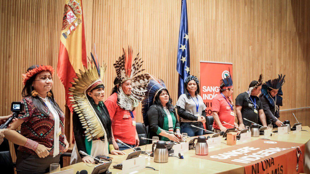 Sala Ernest Lluch del Congreso de los Diputados. Un silbido sobresalta a las casi 200 personas presentes. Lo que hasta el momento era un murmullo de conversaciones desenfadadas se torna en un silencio expectante. Todos giran la cabeza hacia el fondo de sala, desde donde el indígena Elizeu Guarani hace sonar su silbato amazónico. La delegación indígena, ataviada con tocados tradicionales, se encamina hacia el escenario mientras entona un cántico, con una armonía acústica que hace olvidar que este episodio tiene lugar en Madrid y no el corazón del Amazonas.