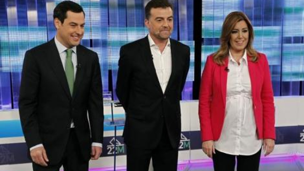 Juan Manuel Moreno Bonilla, Antonio Maíllo y Susana Díaz, candidatos a la presidencia de la Junta de Andalucía, perdieron este lunes una ocasión histórica de demostrar que tienen reflejos y que están por la labor de escuchar el recado de la calle. Por mucho que la legislación vigente les dé la razón, y les permita debatir solos por representar a los únicos tres partidos que tenían diputados en la anterior legislatura, han desaprovechado una oportunidad única de dotarse de autoridad moral y demostrar cintura abriendo el abanico para dejar participar en el debate de este lunes a quienes las encuestas otorgan esta vez una amplia intención de voto.