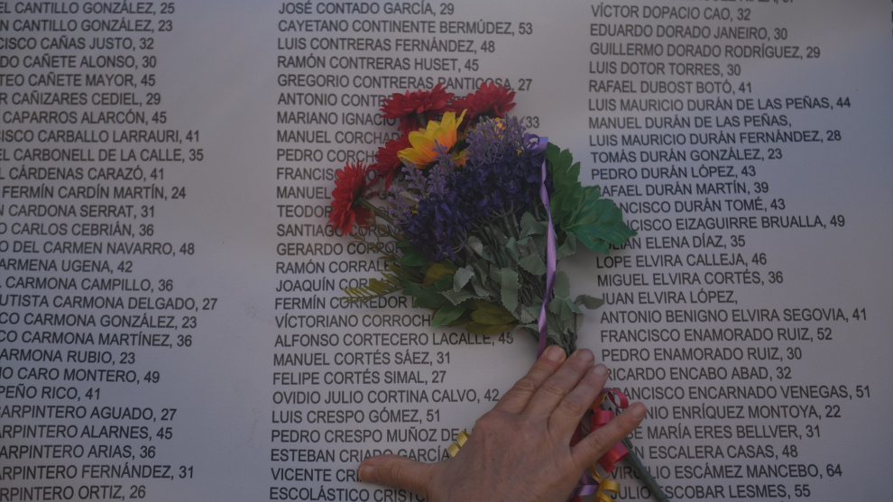 Una persona deposita un ramo de flores con los colores de la república en el XVII Homenaje a las víctimas del franquismo en Madrid, en Madrid.Europa Press