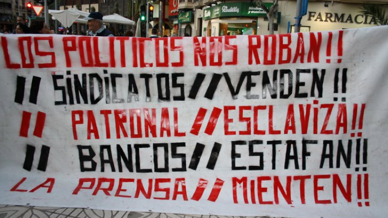 Se han querido presentar los contenidos de reforma institucional como el referente central del movimiento 15M. Pero en la nueva arquitectura política nacida de la indignación, también hay propuestas económicas. Radicales. La política es el cauce para cambiar las condiciones de vida. Cuando se pide Democracia Real Ya se está diciendo que hay que acabar con la interpretación contraria: que la política basada en la democracia representativa es solamente el medio, no el fin. El fin es la democracia real (procedimientos al servicio del poder popular), la emancipación, la justicia, la libertad. El método asambleario ha roto el “esto es lo que hay”. El programa creado por el movimiento, como un cuaderno de quejas revolucionario, recorre toda la médula espinal de la sociedad. Han cuajado las propuestas políticas (ley electoral, transparencia, lucha contra la corrupción y división de poderes), pero hay también propuestas económicas radicales. Un movimiento que nace en la Europa rica no puede tener los rasgos que habría adquirido en otros lugares del mundo. Pero eso no significa que la lucha de frases haya sustituido a la lucha de clases. Muchas de las propuestas demuestran que se ha empezado a andar el camino de las transformaciones estructurales: defensa integral del Estado social, fin de los paraísos fiscales, oposición al “Pacto del euro”, freno a los desahucios, impuestos para los ricos, reducción de la jornada electora…El lema de Juventud sin Futuro, otro de los convocantes del 15 M, lo deja claro en su lema: sin casa, sin curro, sin pensión. Y sin miedo. Todas propuestas de eso que antes, cuando no era de tan mal gusto, se llamaban reivindicaciones de clase. Las que los sindicatos ya no tienen fuerza para reclamar.